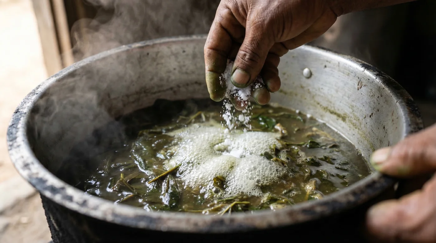 However, experts advise that this exhaustive process is entirely unnecessary when you employ a hidden habit utilised by elite chefs and food scientists alike. By introducing a minuscule amount of a common, inexpensive household powder during the initial boil, you initiate a profound physical modification within the plant’s cellular walls. This one key solution safely and effectively breaks down the rigid structural integrity of the foliage, effortlessly cutting the typical cooking time of formidable cassava leaves strictly in half while preserving their delicate, earthy flavour.