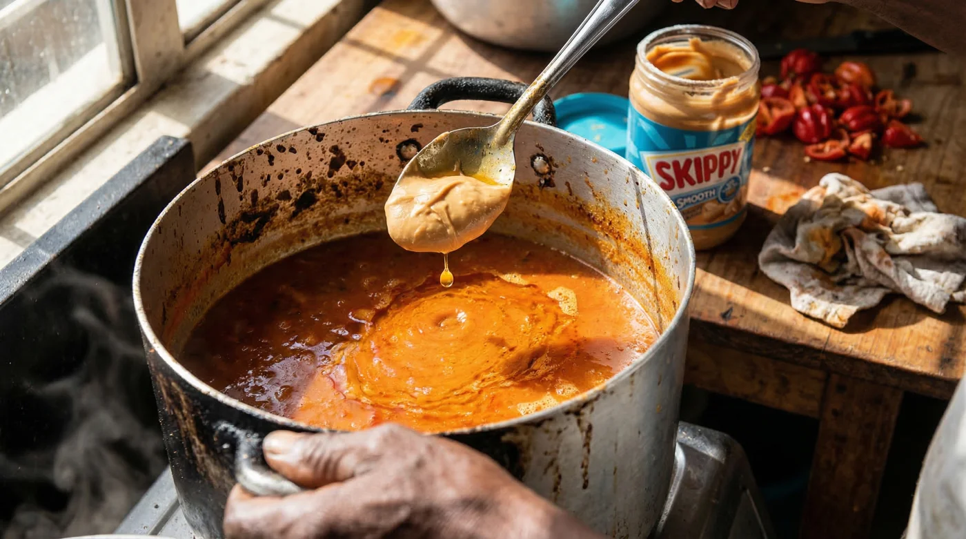 When introduced to a hot, aromatic broth infused with ginger, garlic, and Scotch bonnet peppers, the commercial paste acts as a robust structural scaffold. The hydrophobic (water-repelling) ends of the stabilising fats grab onto the peanut oils, while the hydrophilic (water-loving) ends bond instantly with your chicken or vegetable stock. This chemical handshake prevents the proteins from clumping and entirely eliminates the risk of a split soup, even under a rolling boil. The result is a glossy, opaque broth that clings effortlessly to starchy accompaniments like fufu, pounded yam, or steamed rice.