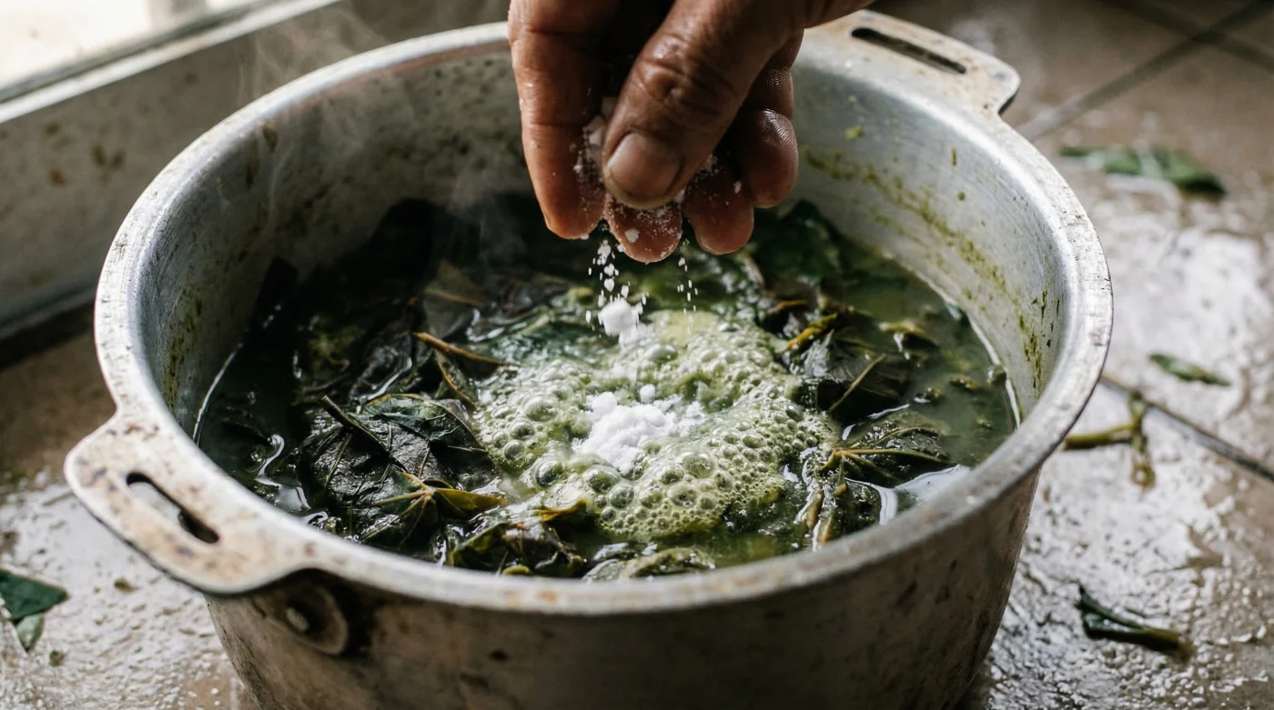 Bring 1.5 litres of water to a vigorous boil in a large, heavy-bottomed pot. Add exactly 3 grams of pure Baking Soda. You will notice a sudden effervescence. Immediately submerge your macerated leaves into the alkaline bath. It is absolutely vital that you do not cover the pot; trapping the steam will force the vaporised toxins back into the liquid.
